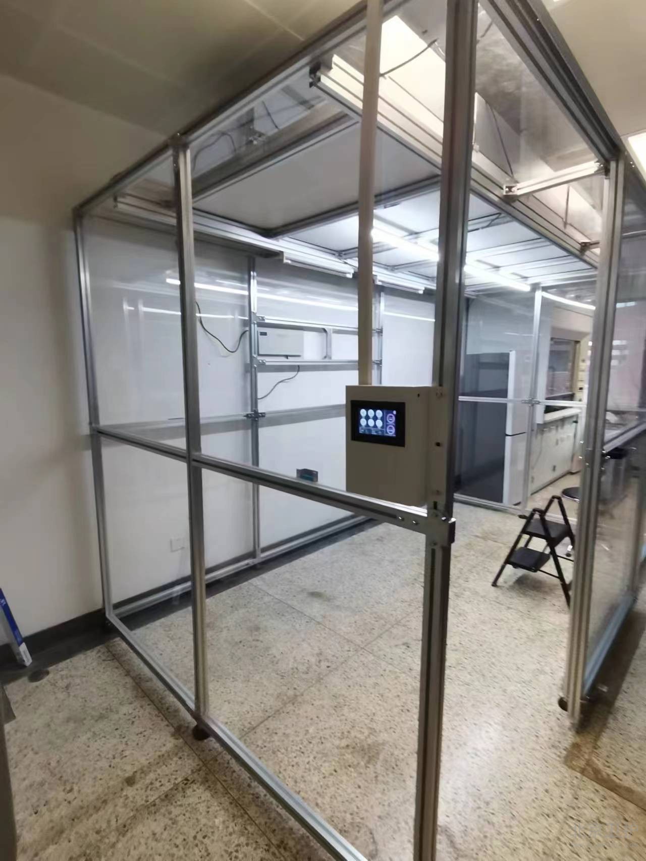 9月份我公司接到此項(xiàng)目后便抓緊時(shí)間出具相關(guān)方案、設(shè)計(jì)圖紙,經(jīng)過(guò)不斷的溝通和改動(dòng),最終確定施工方案。此單位潔凈棚設(shè)計(jì)面積20平米,主體材質(zhì)為鋁型材,隔離板使用亞格力板,頂部配有紫外線(xiàn)燈輔助殺菌,過(guò)濾系統(tǒng)為百級(jí)凈化模塊,并配有我公司研發(fā)的控制系統(tǒng)。從最初的方案設(shè)計(jì)、安裝施工,到最后的驗(yàn)收,總工期為10個(gè)工作日。