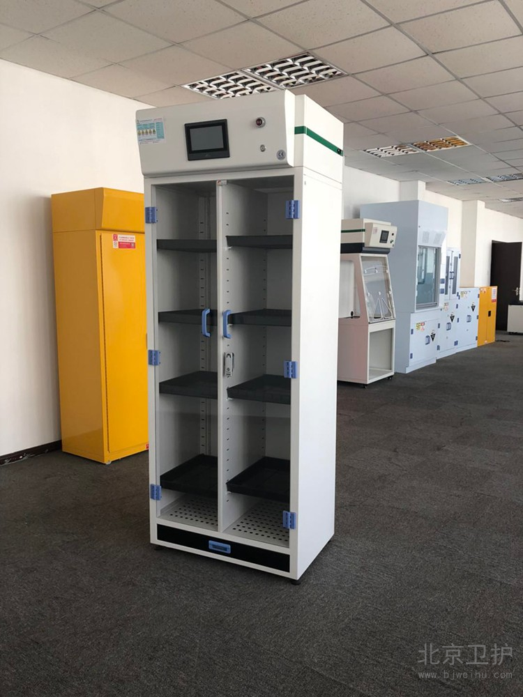 凈氣型儲(chǔ)藥柜頂部配備風(fēng)機(jī)和過(guò)濾裝置,風(fēng)機(jī)運(yùn)轉(zhuǎn)使得柜內(nèi)形成負(fù)壓,空氣從進(jìn)氣口進(jìn)入,有毒氣體和粉塵的空氣將被活性炭過(guò)濾器和高效粒子過(guò)濾器過(guò)濾,經(jīng)過(guò)過(guò)濾后潔凈的空氣返回室內(nèi)。凈氣型儲(chǔ)藥柜用來(lái)保護(hù)實(shí)驗(yàn)室人員在存儲(chǔ)化學(xué)品時(shí)帶來(lái)的吸入危害,同時(shí)能夠24小時(shí)不間斷的對(duì)室內(nèi)空氣進(jìn)行循環(huán)過(guò)濾。